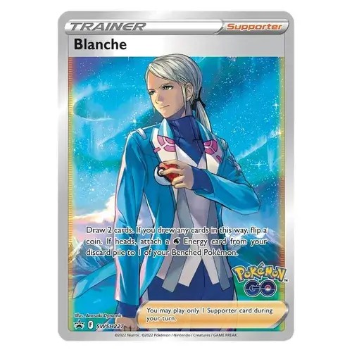 A full-art foil promo card featuring Blanche