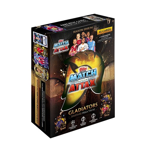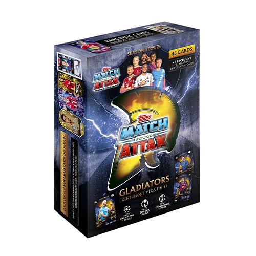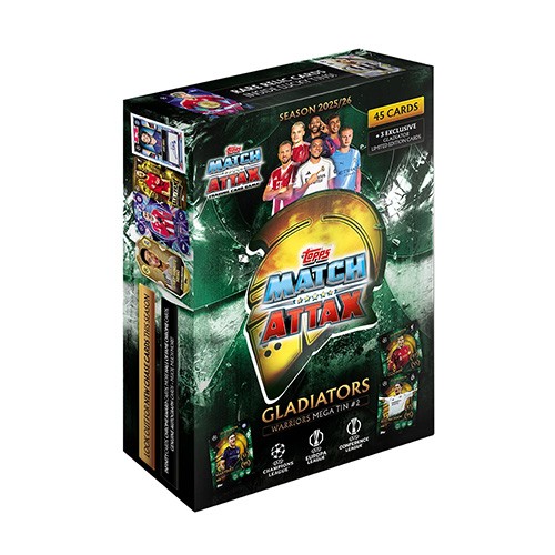 45 Match Attax Trading Cards • A mix of base cards featuring players from the UEFA Champions League, Europa League and Europa Conference League across the 2025/26 season. ⭐ 3 Exclusive Limited Edition Cards • Cards only available inside the Mega Tin (often themed e.g., Gladiators LE cards or other special chase cards). ⭐ Collector’s Tin • A durable metal storage tin to keep all cards safe and organized. 🎯 Possible Bonus Inserts (very limited) • On lucky tins, relic cards may appear (e.g., Medal Winner manufactured relics or player-worn jersey relic cards) — rare bonus chase hits.